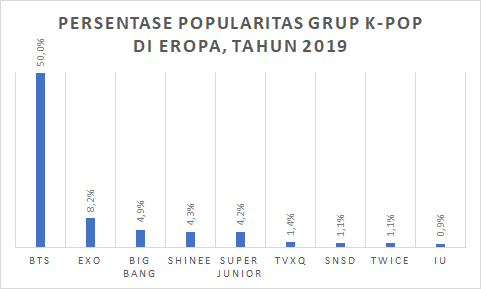 Data Spotify tadi pun didukung oleh hasil survey yang dilakukan oleh Korean Tourism Organization memperlihatkan popularitas BTS yang masif di antara para responden survey asal Eropa. Data ini pun terbilang unik, karena terdapat nama-nama Grup generasi 2 yang terbilang legendaris seperti Bigbang, SHINee, Super Junior, TVXQ/DBSK, maupun SNSD/Girls’Generation. Dapat disimpulkan bahwa pendengar K-Pop di Eropa mempunyai masih menggandrungi para veteran grup dari generasi 2 ini di kala grup-grup generasi 3 seperti; TWICE, BLACKPINK, Red Velvet, MONSTA X dll. ataupun generasi 4 seperti; AESPA, ITZY, TXT, Stray Kids, NCT (khususnya NCT Dream), mulai mendominasi skena K-Pop.